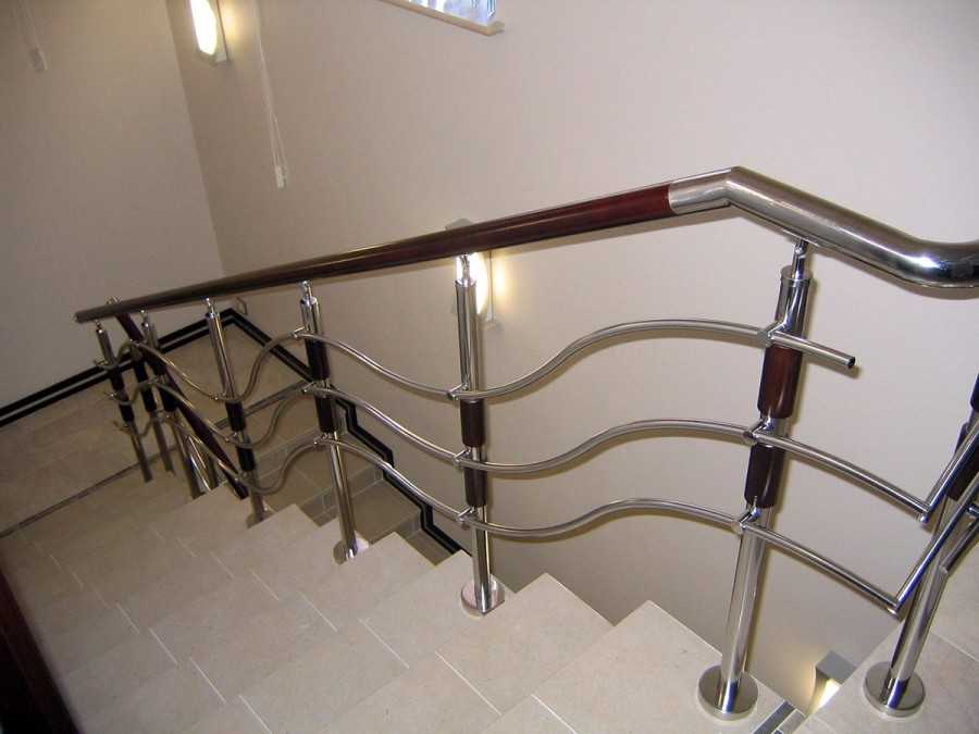 В сочетании с балясинами из металла получается оригинальный вариант для офисного здания. Для создания гармоничного интерьера используют накладки для перил из поливинилхлорида (цена на которые ниже, чем на круглые или прямоугольные поручни), подбирая их в тон плинтусам или ступеням.