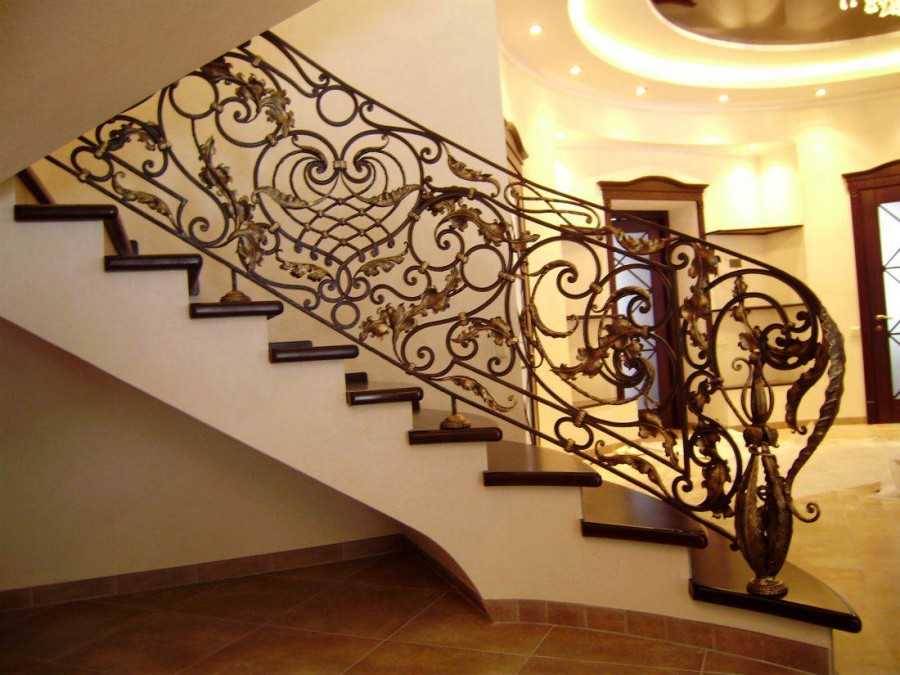 Кованые ажурные перила привлекают своей красотой и индивидуальным дизайном. Красиво смотрятся в черном, белом и золотом цвете, а также в различных комбинациях данных цветов. Технология изготовления кованых изделий подразделяется на два вида: