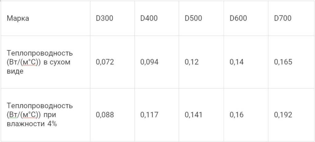В зависимости от пропорций исходных ингредиентов можно получить продукт с различными эксплуатационными характеристиками. Коэффициент теплопроводности газосиликатного блока зависит от его плотности и определяется по маркировке: D300, D400, D500, D600, D700.