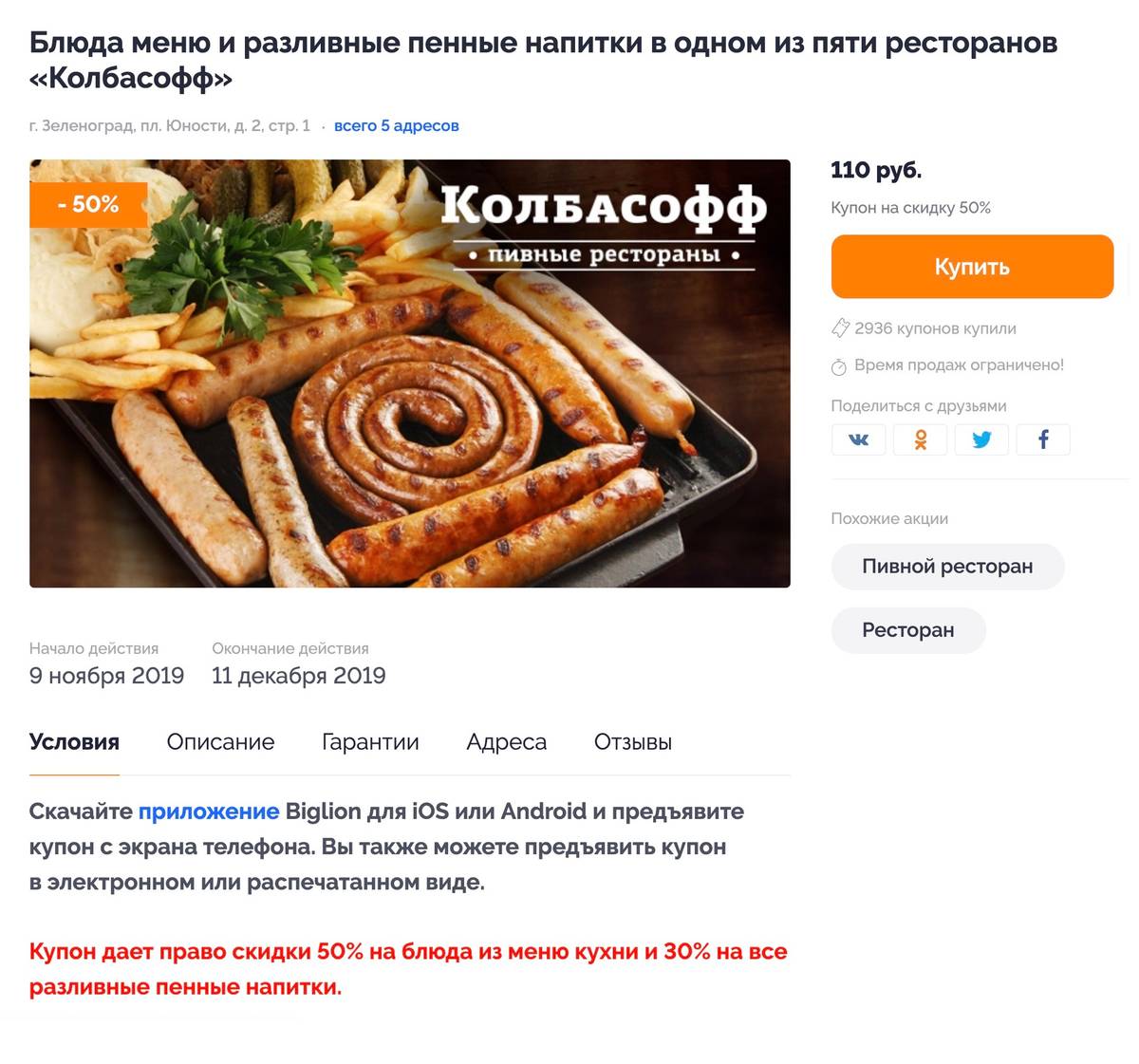 Я вот, например, люблю «Колбасофф». Однажды нашел купон на скидку 50% в этот ресторан — пошли вчетвером и сэкономили 4000 Р. А сам купон стоил всего 110 Р.