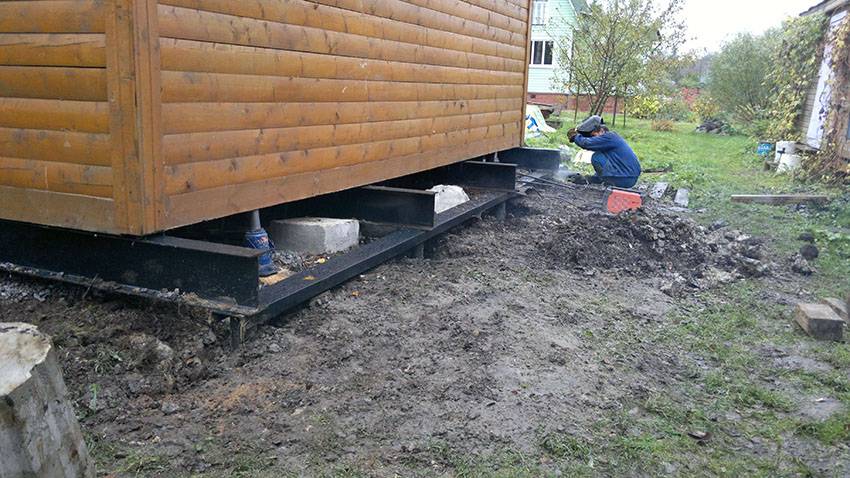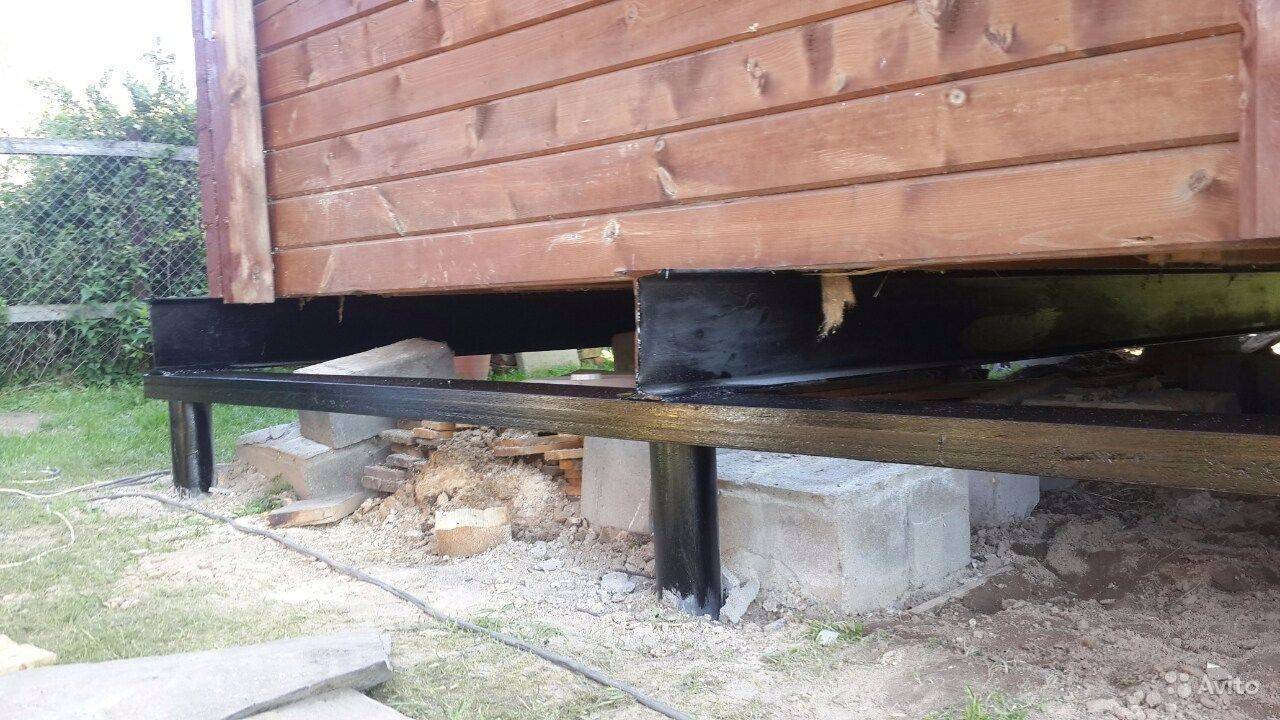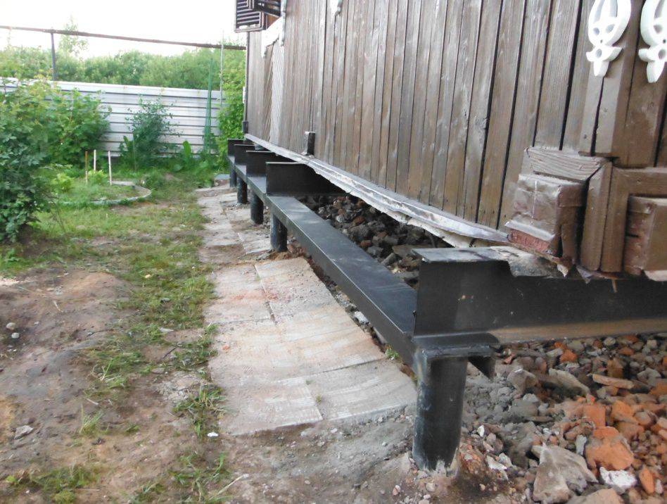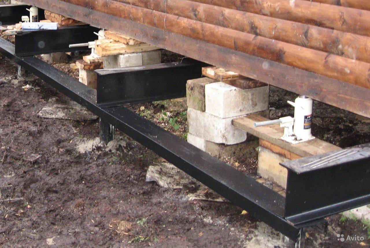 Воздымается усадьба на такую высоту, чтобы можно было вставить двутавровую балку. Под домкрат подкладывают опору, можно дощечки. Иначе рычаги могут провалиться под землю.