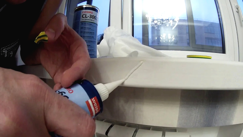 Реставрация начинается с заполнения клеем крупных трещин, после чего необходимо обезжирить поверхность и намазать ее клеевым составом. Накладка необходимого размера прикладывается к подоконнику и прижимается грузом. Поверхность должна сохнуть на протяжении 6 часов. Торцевой край нагревается строительным феном и загибается по форме подоконника.