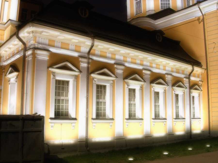 - Если в фасад вмонтированы выступы, рельефные барельефы, то мощная подсветка будет создавать тень по контуру выступов.