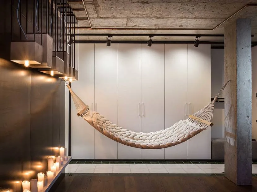 - При расположении колонны рядом со стеной, в стороне от проходной зоны, с её помощью легко зафиксировать гамак. Такой метод превратит эту зону комнаты в полноценное место для отдыха. Аналогичным способом можно использовать её в качестве одной из точек для опоры крепления другой встроенной мебели (кухонного островка, барной стойки, обеденного стола).