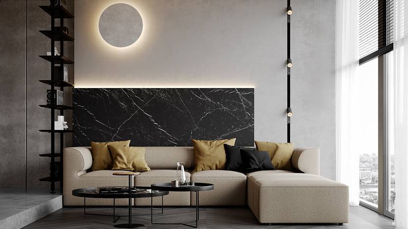 Скрытые светильники и ленты помогают выявить необычную текстуру, рельефность и объем отделки.