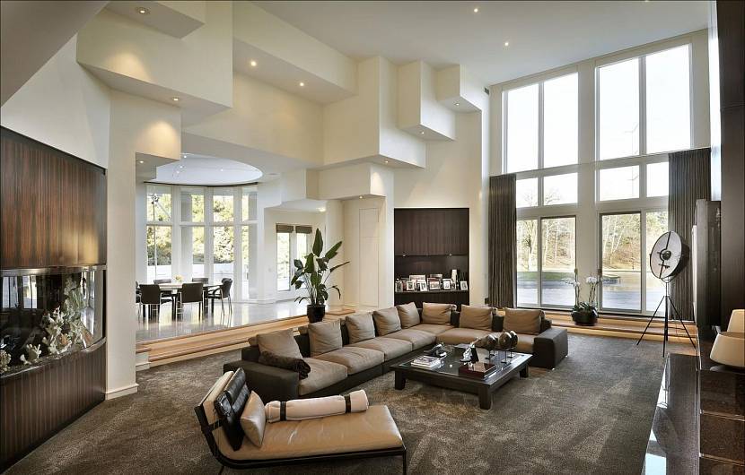 В просторном зале, особенно если он расположен в частном доме, главное достоинство интерьера – это большие окна. И именно на них целесообразно сделать главный акцент при создании дизайна гостиной. При грамотном оформлении окон и стен остальные детали интерьера легко впишутся в задумку.