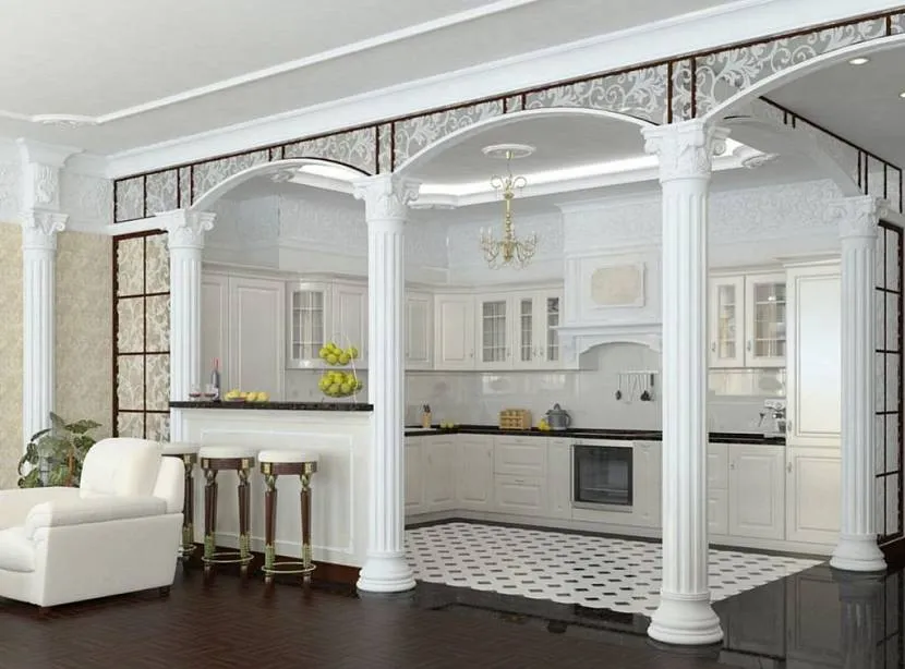 Зонирование. Разграничение зон актуально для больших комнат, а также для квартир-студий. Для зонирования, как правило, применяются аккуратные и негромоздкие колоннады. Они представляют собой ряд колонн в одном стиле. С помощью колоннады получается сделать интерьер легким и необычным.