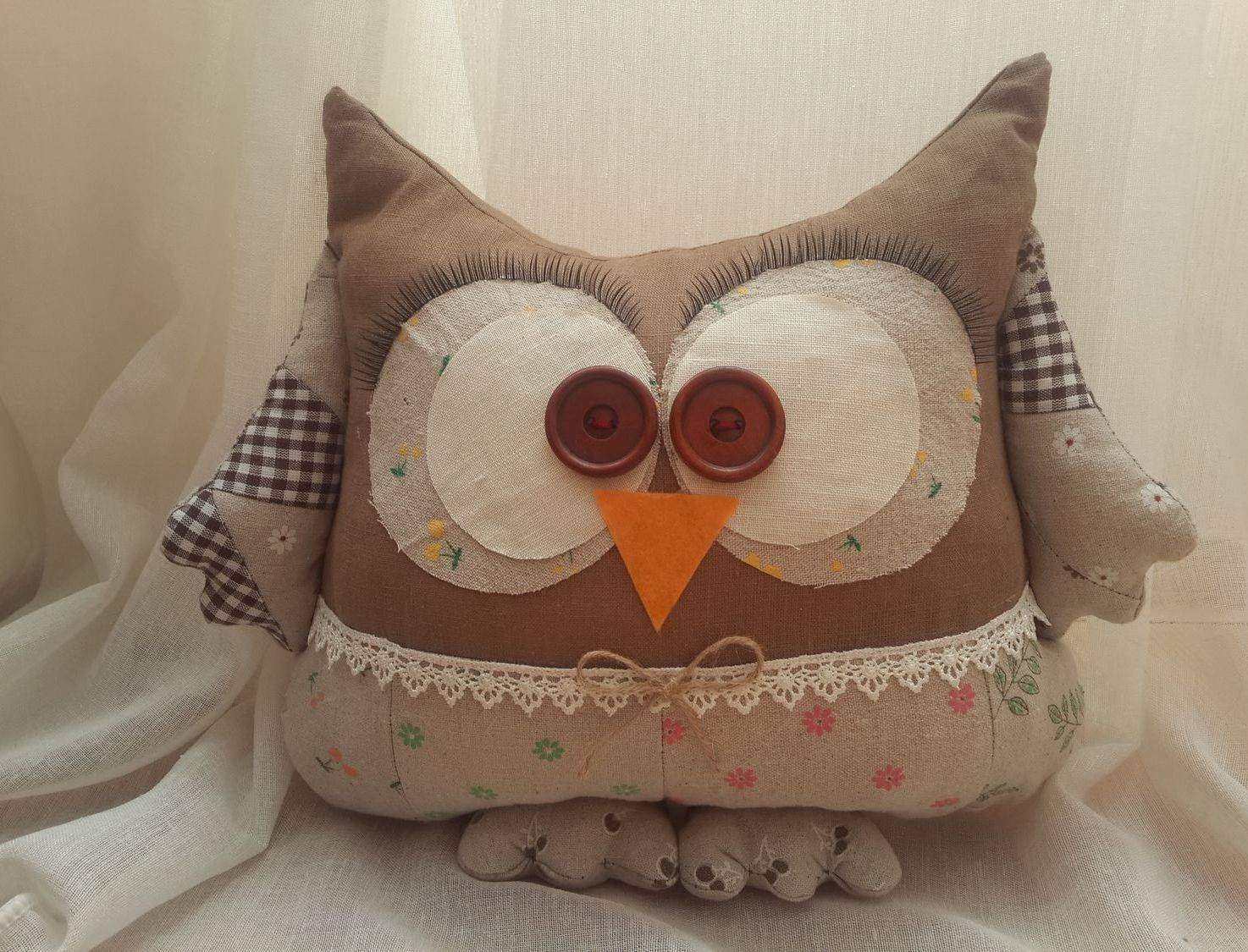 Клюв, глаза, кружева, крылья пришить к первой детали зигзагом, зрачки на руках. Половинки совы сложить лицевыми сторонами, сколоть, прошить, оставив отверстие, вывернуть, набить синтепоном.