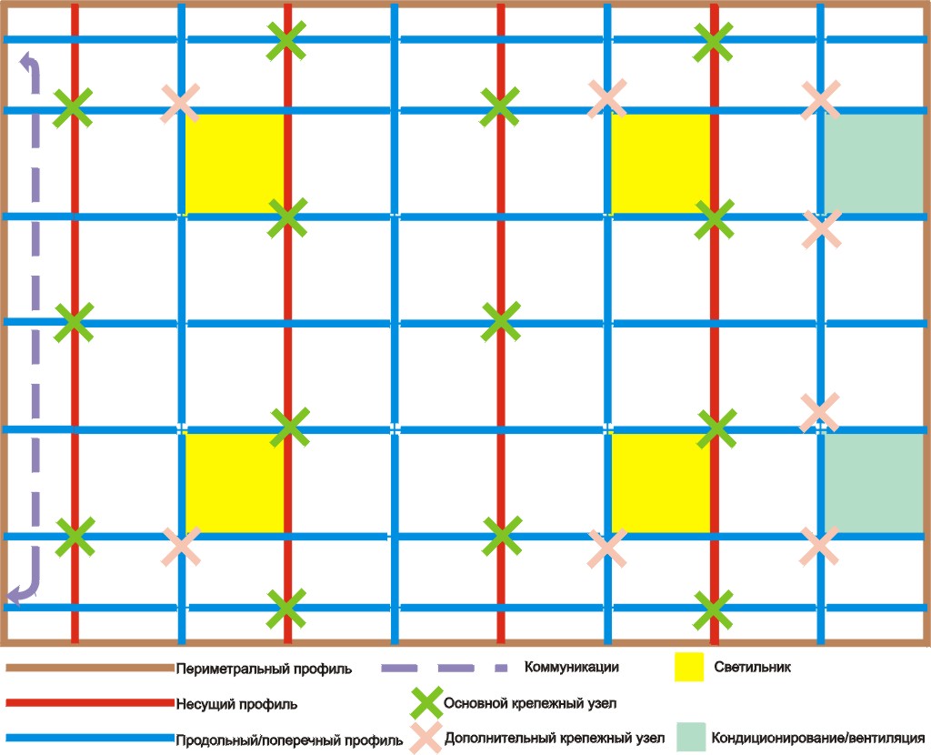 При разметке на потолке отверстий под крепежные узлы подвесов особой точности не требуется: небольшой наклон подвеса легко компенсируется регулировкой его высоты. Пример расчетной схемы потолка армстронг приведен на рисунке.