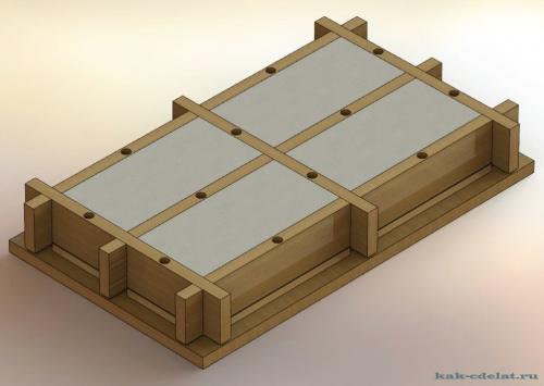 Форма для заливки шлакоблока зачастую изготавливается из цельных деревянных досок, также могут использоваться металлические листы. Доски при этом должны быть с гладкой поверхностью для более удобного извлечение блока. Состоит из четырех боковых досок, то есть из двух одинаковых по размерам пар досок, по высоте все четыре доски должны быть одинаковы и пятой доски для дна формы. Так же изготавливают формы и без дна, но при этом пол помещения или улицы где будут заливаются формы, должна быть подготовленной, ровной, твердой и чистой. Для ускорения процесса сбивают и изготавливают форму сразу для нескольких шлакоблоков 5-10 штук, с перегородками внутри.