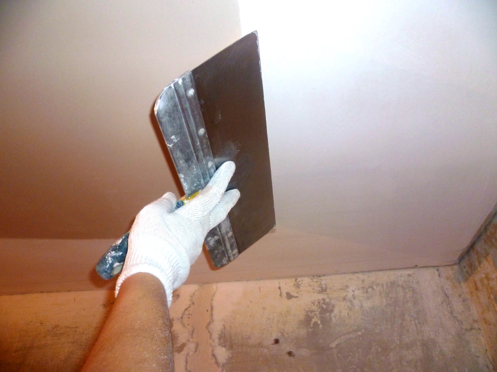 При выполнении работ собственными силами, лучше воспользоваться универсальным раствором. В таком случае потолок шпатлюется только один раз (нет необходимости наносить вначале стартовую, а затем финишную шпатлевку). Естественно, и шлифовать нужно будет только раз.