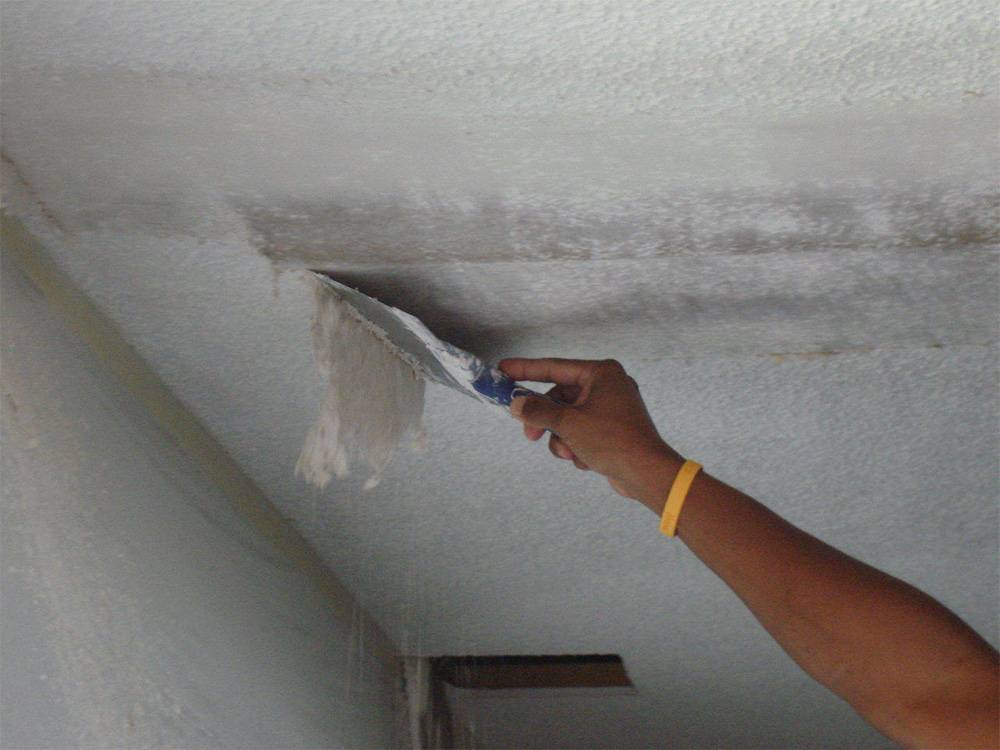 Если на потолке ранее использовалась известковая побелка, то проще всего избавиться от нее, хорошо смочив потолочную поверхность. Известь обладает прекрасной впитываемостью, поэтому лучше всего нанести воду несколько раз. Чем толще слой побелки, тем больше влаги потребуется.