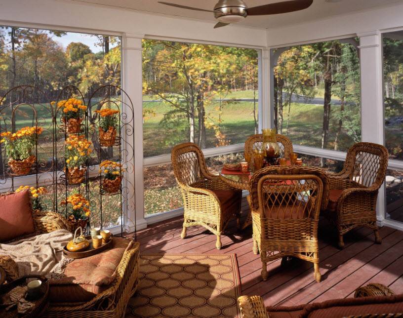 Это распространённый вариант, в котором основной задачей станет выбор правильного размера мебели. Важным моментом станет предпочтение в выборе дивана, ведь большой диван будет смотреться некрасиво на маленькой веранде, забирая всё её пространство, ровно также само, как диван маленького размера может просто затеряться в помещении.