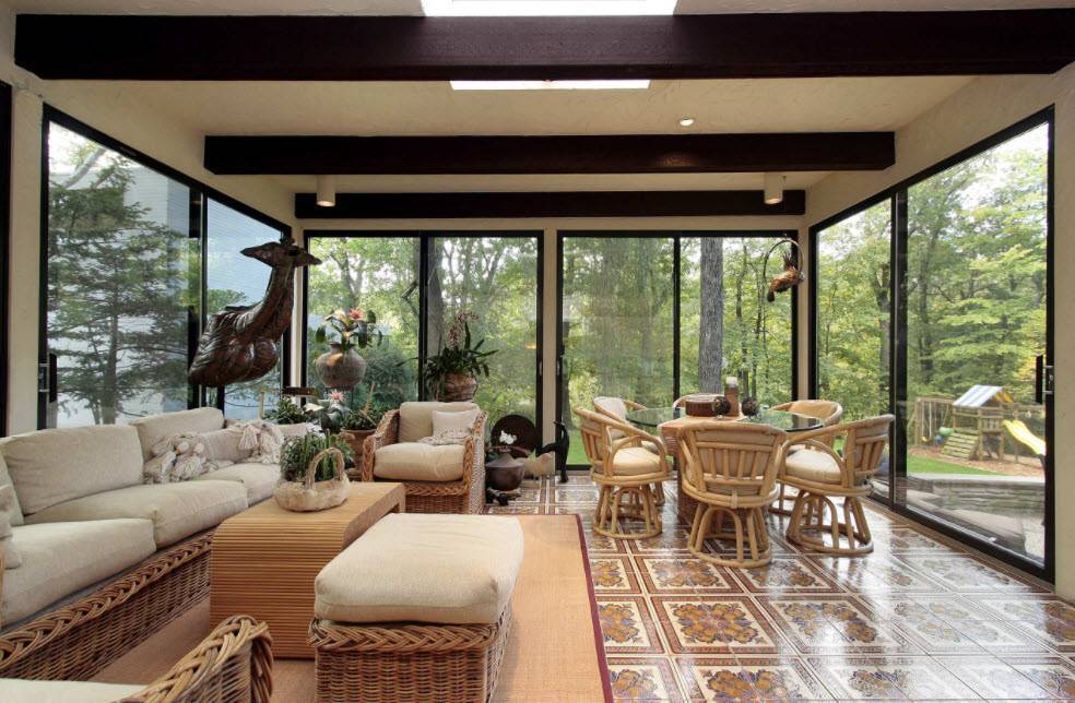 Напольному покрытию веранды нужно уделить особое внимание. Выбор того или иного вида покрытия будет во многом зависеть от условий эксплуатации. Для отделки пола веранды можно использовать террасную или массивную доску, ламинированные панели, керамическую плитку и другие популярные напольные материалы