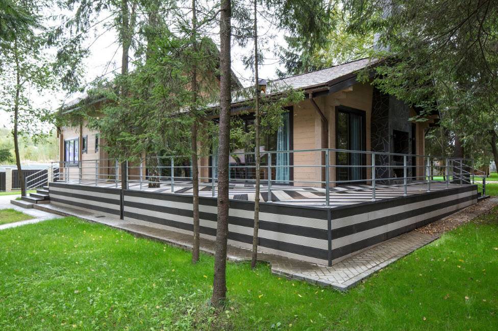 Еще один элемент зависит от высоты цоколя дома. Настил террасы обычно расположен в одном уровне с полом первого этажа. Если цоколь высокий, то, чтобы спуститься во двор, делают либо ступеньку, либо небольшую лестницу с перилами.