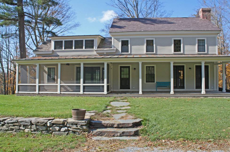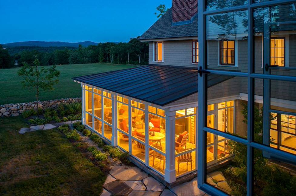 Для домов, облицованных кирпичом или камнем такой вариант наиболее подходящий. Облицовка наружных стен выполняется по технологии вентилируемого фасада (СП 70.13330.2012). Как правило, при этом делается утепление, позволяющее эксплуатировать дачную веранду круглый год. Для отделки используются: