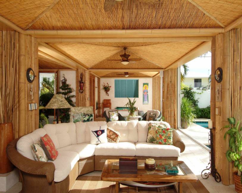 Плетеный потолок — это красивый элемент ландшафтного дизайна, который одинаково хорошо подходит для каменных, деревянных, каркасных домов. Существует два варианта плетеного потолка: дешевый — из листов влагостойкой фанеры и дорогой — из бамбуковых лент. В первом случае потолок обходится недорого, а монтаж выполняется быстро: фанера режется на полосы, которые переплетаются между собой. Листы бамбукового плетения продаются в готовом виде. После покупки их просто сплетают между собой при помощи имеющихся напусков и накрывают полученным материалом предварительно подготовленную обрешетку.