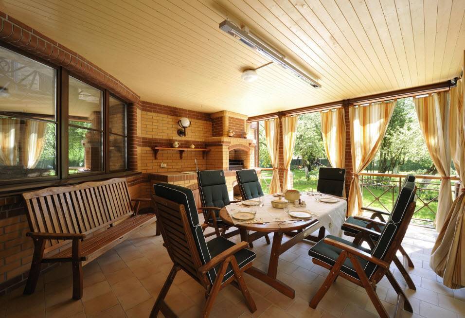 В случае с открытой верандой следует использовать плотную темную ткань по периметру постройки. В дневное время шторы можно просто собрать и подвязать. Их цель не обеспечить полную темноту, а сделать помещение закрытым, спрятать вашу вечеринку от лишних глаз. Возможно, не каждые выходные вы будете проводить подобным образом. В этом случае с веранды можно унести все, кроме барной стойки и использовать ее для других целей. Можно вынести раскладную мебель и организовать ту же столовую или гостиную, ведь розетки под печь или магнитофон у вас уже есть. Вот так просто можно сделать свой отдых на природе активным, насыщенным и разнообразным.