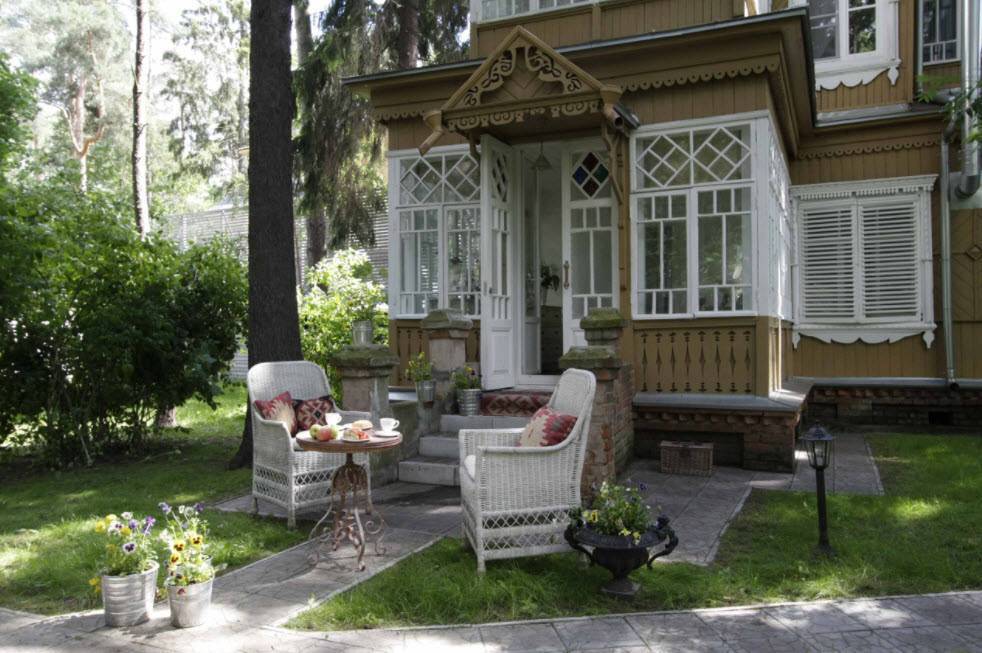 Плетеные мебельные предметы подходят для построек, изготовленных из кирпича, сайдинг – панелей или дерева. С их помощью организовывается комфортная зона отдыха, где можно вести семейные разговоры, пить чай с друзьями и просто отдыхать на свежем воздухе.