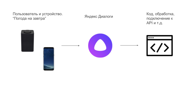 Что такое навык? Навык, это некий код, которому Алиса отправляет фразу, сказанную вами… там эта фраза как-то переваривается этим неким кодом, делает внутри некоторую магию, а в ответ отдает точно такую же фразу, но которую уже говорит вам голосом Алисы (Оксаны, Эдварда и т.д.).