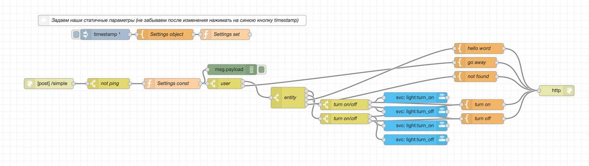 Для того, чтобы написать код для навыка нам даже не понадобится писать код, мы просто воспользуемся стандартными блоками Node-red.