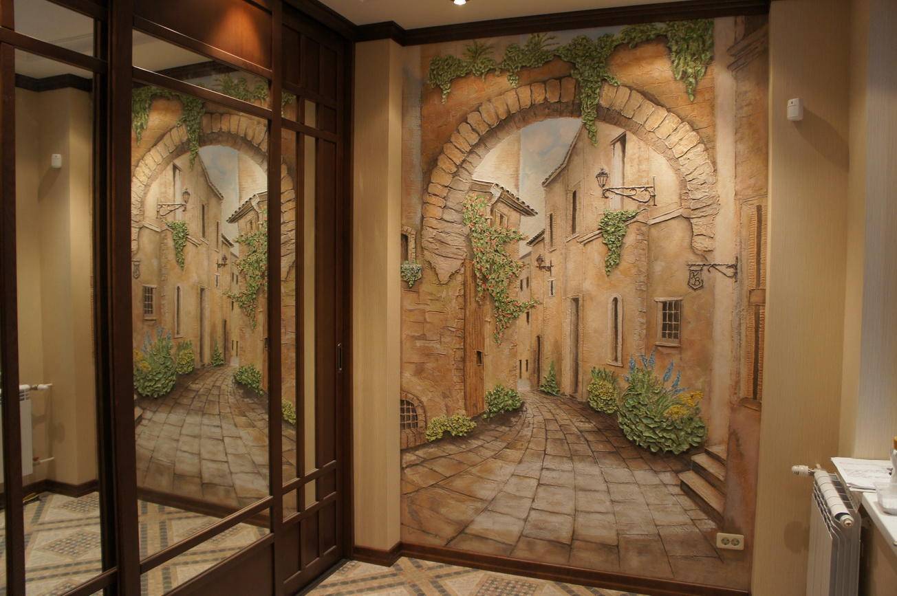 Современные технологии позволяют наносить рисунок на фасады мебели, на зеркала паркетную доску. Такое оформление визуально изменит коридор, добавит ощущение воздуха и пространства, чего не хватает прихожим.