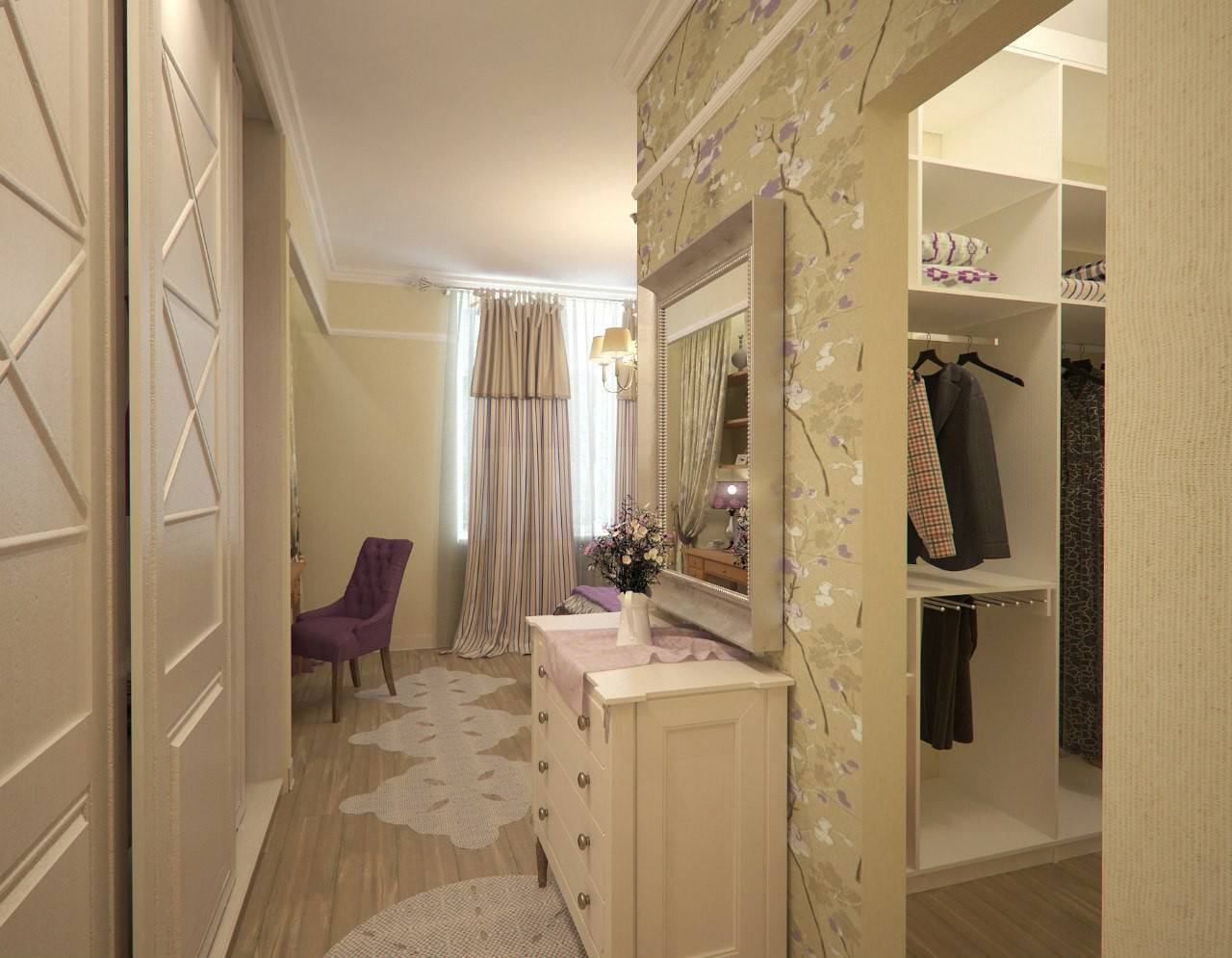 Дизайн прихожей в стиле прованс, отделка стен бумажными обоями.