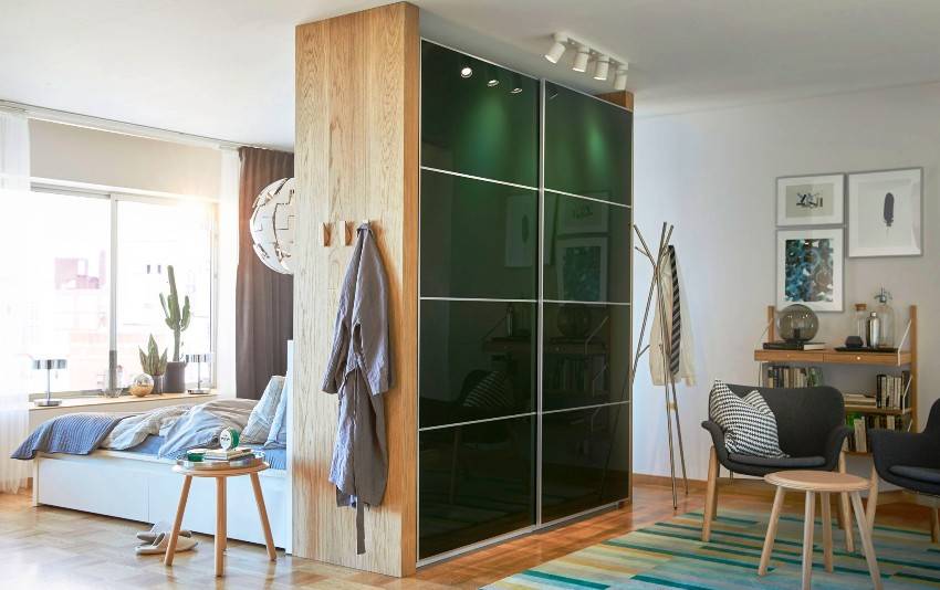 Мебельная конструкция встроенного типа также может исполнять роль межкомнатной перегородки.