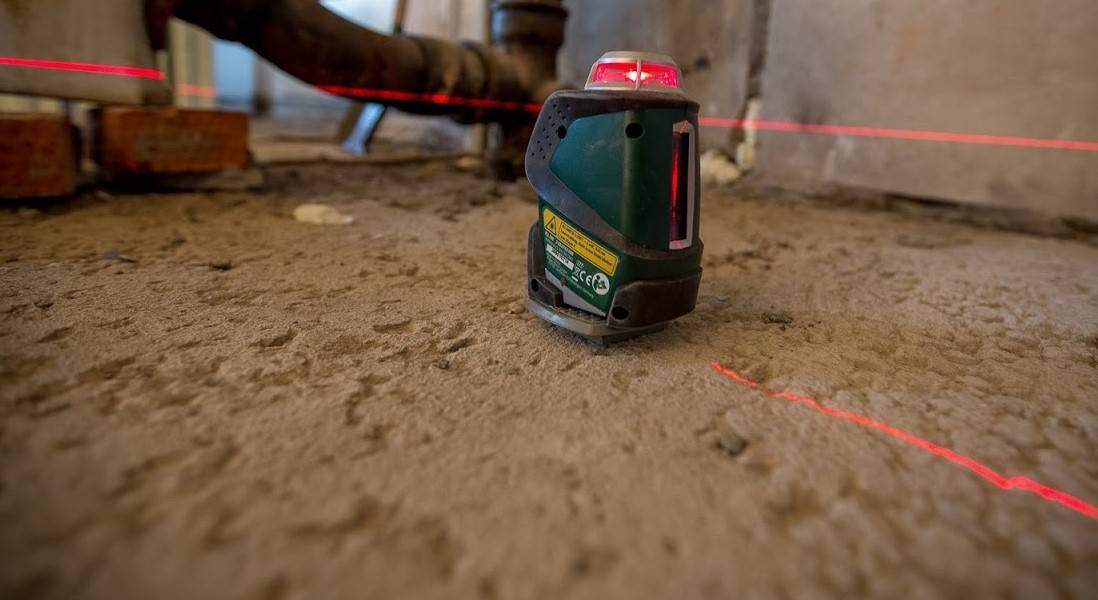 - Нижняя часть стен должна на этом этапе иметь отметки ширины пола, по которым будет выполняться стяжка. Это сделать можно лазерным уровнем, который охватит все углы и наклоны. При этом отмечается и наивысшая точка пола, определяются и берутся в расчёт перепады высот. Подготавливается нужный объём смеси. Полусухая стяжка идеальна для работ в помещениях с перепадом высот.