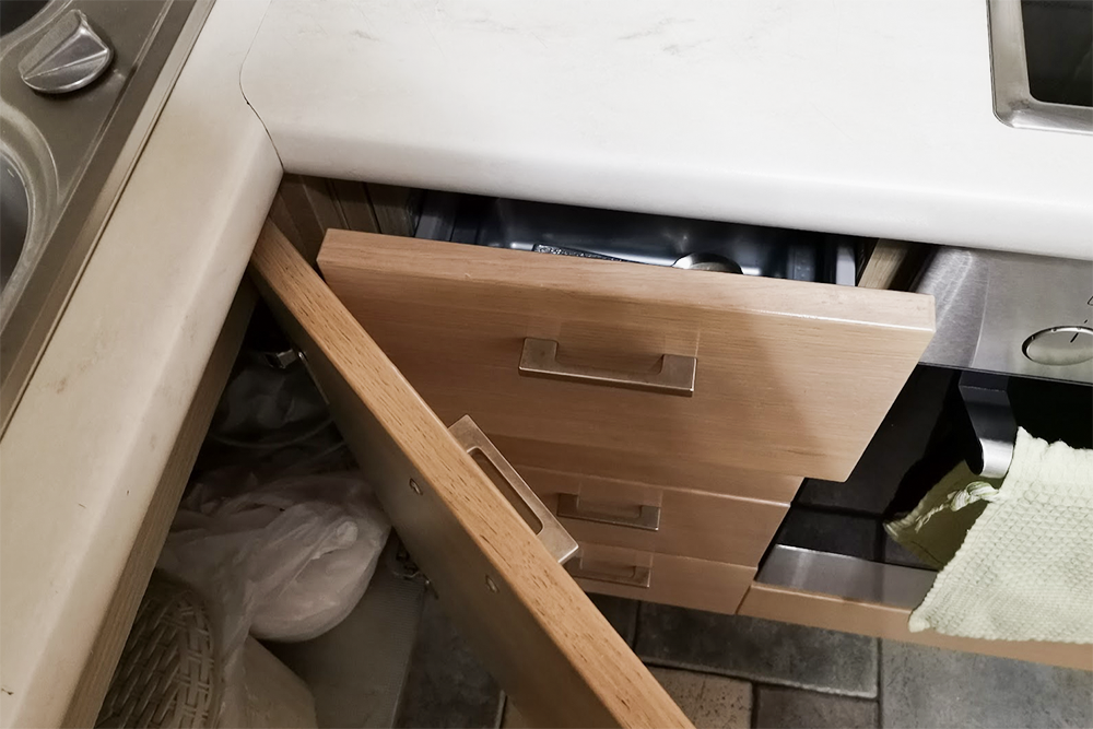 Если пересекаются траектории открытия дверец и ящиков кухонного гарнитура, то есть только один выход: исключить совместное использование конфликтующих элементов, то есть разложить по ящикам продукты, которые не нужны одновременно.