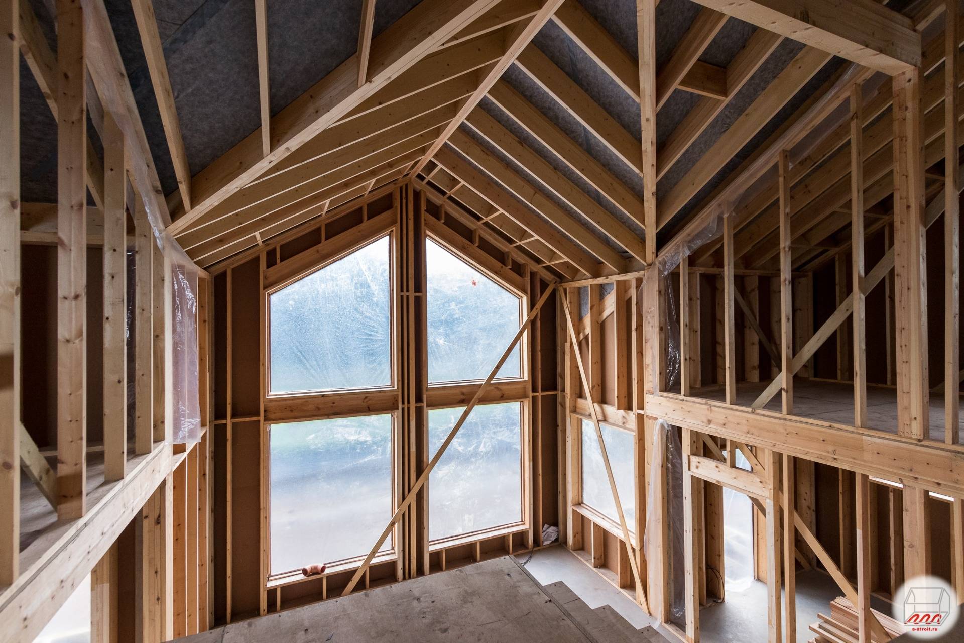 Немаловажным аспектом является и обшивка конструкции каркаса листовыми материалами, правильное осуществление каковой обеспечит стабильность конструкции дома при горизонтальных нагрузках от ветра. В такой ситуации наиболее правильное решение – подход комплексного характера. При таком подходе обшивка производится листовыми стройматериалами и производится монтаж дополнительных «укосин» в обвязке. Для конструкции дома из одного этажа подходит OSB толщиной 9 мм, для 2-х этажного сооружения необходимо применять OSB толщиной не меньше 12 мм, либо осуществлять зашивку конструкционными плитами 9мм. как снаружи здания, так и изнутри. Это, на наши взгляд, является оптимальным решением, т.к. в таком случае создается необходимая жесткость, а внутренние стены способны выдерживать нагрузки от различных подвесных ящиков и полок. Также нужно помнить, что нужно устаивать зашивку OSB с разбежкой стыков, т.е. верхний ряд плит сдвигать на величину не менее одного шага стоек. Такой метод существенно укрепит жесткость конструкции дома.
