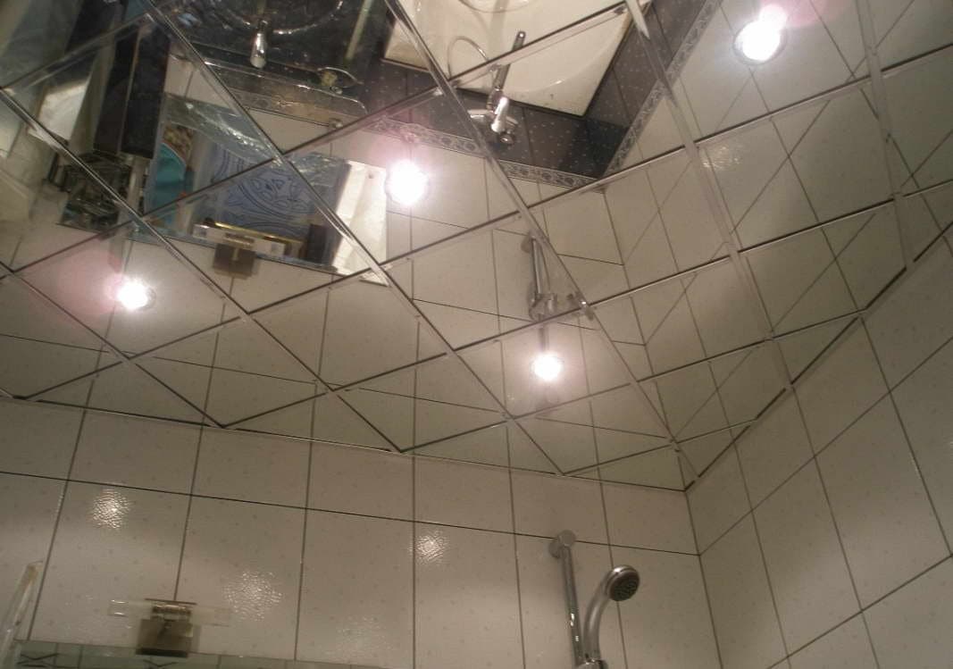 Зеркальный потолок с кассетами Армстронг, который эффектно дополняет интерьер ванной комнаты
