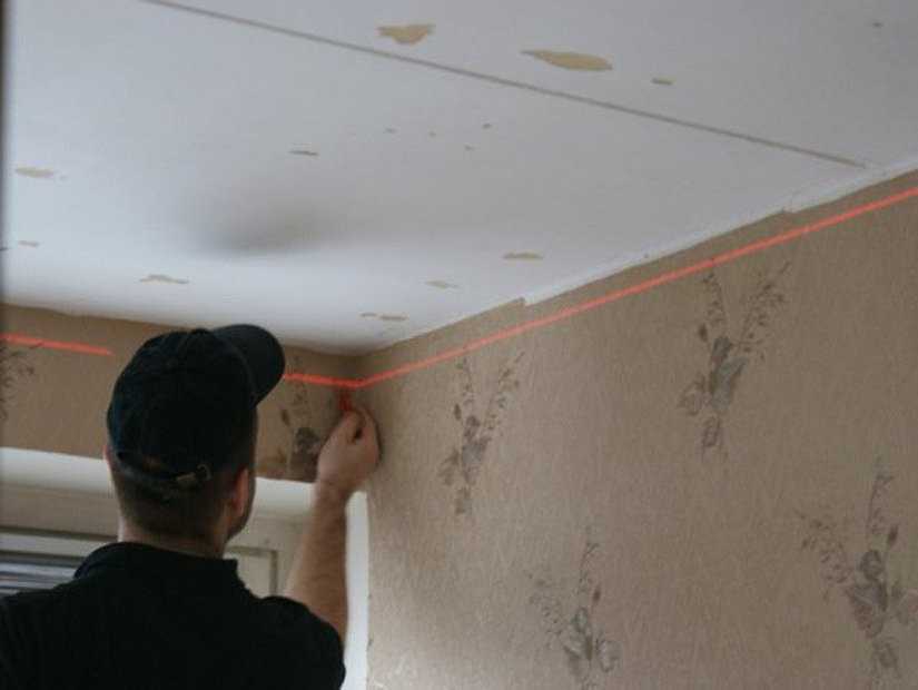 - Отмечаем уровень будущего натяжного потолка с учетом неровностей чернового перекрытия, подпотолочных коммуникаций и ширины корпуса встраиваемых светильников.