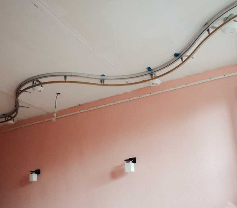 Во время монтажа багета следует точно следовать вышеизложенной инструкции, потому что крепление профиля – самая важная часть в установке натяжного полотна. От правильности установки каркаса зависит не только красота, но и прочность натяжного потолка. Для придания помещению уюта полотно можно дополнить гардиной или декорирующим светом.