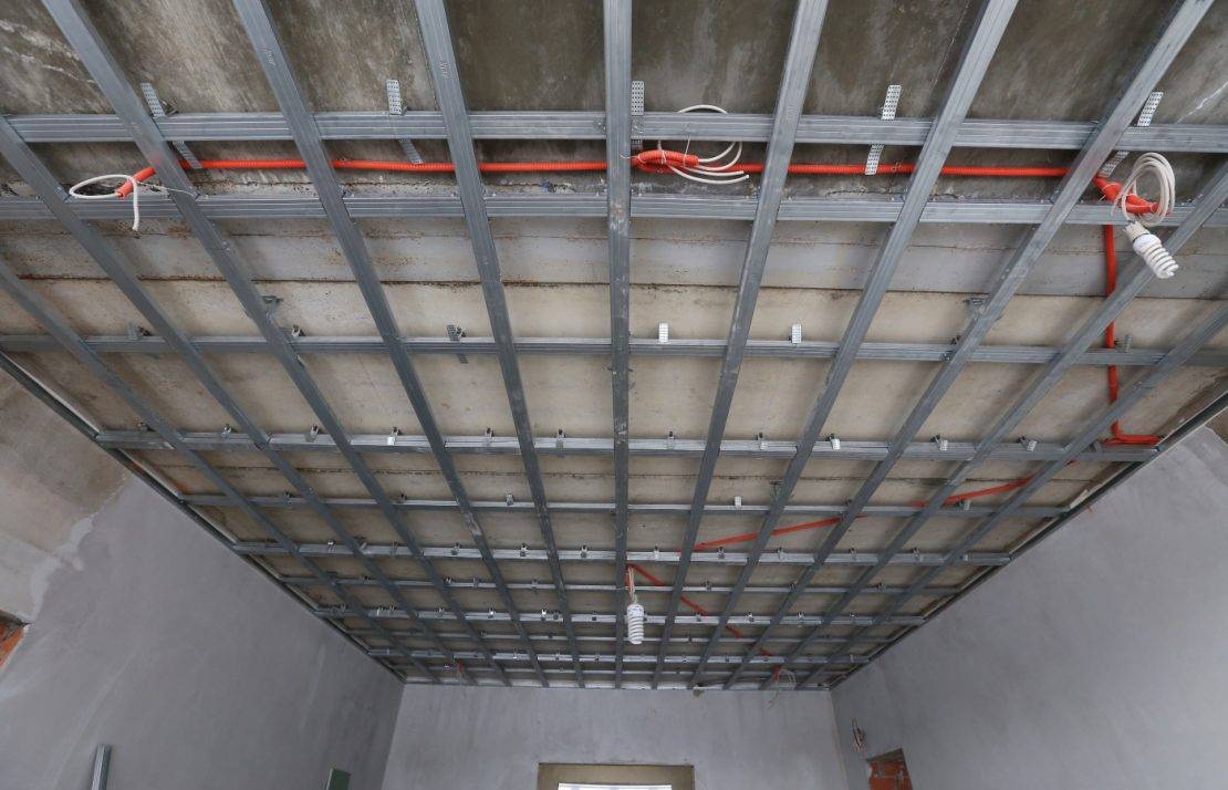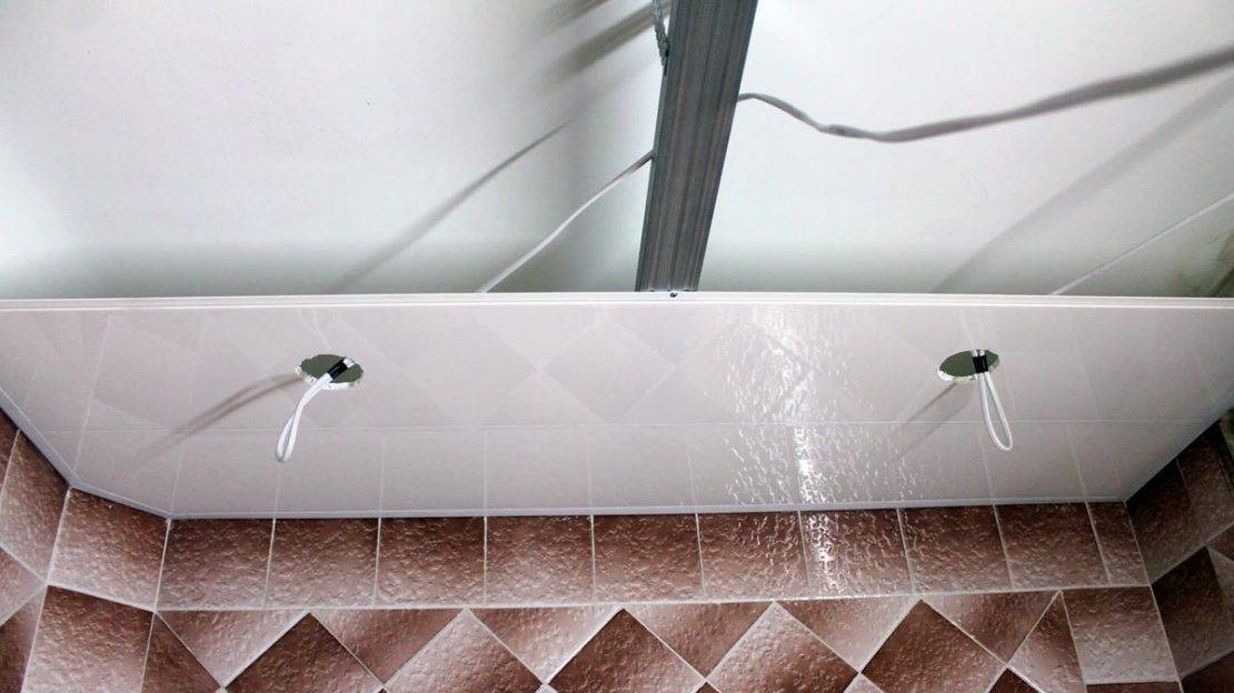 В завершении монтажа каркаса выполняется прокладка силовых кабелей для освещения. При использовании ПВХ панелей провода следует обязательно укладывать в гофру для обеспечения пожаробезопасности. В местах, где будут устанавливаться точечные светильники достаточно оставить петли длинной 10-15 см.