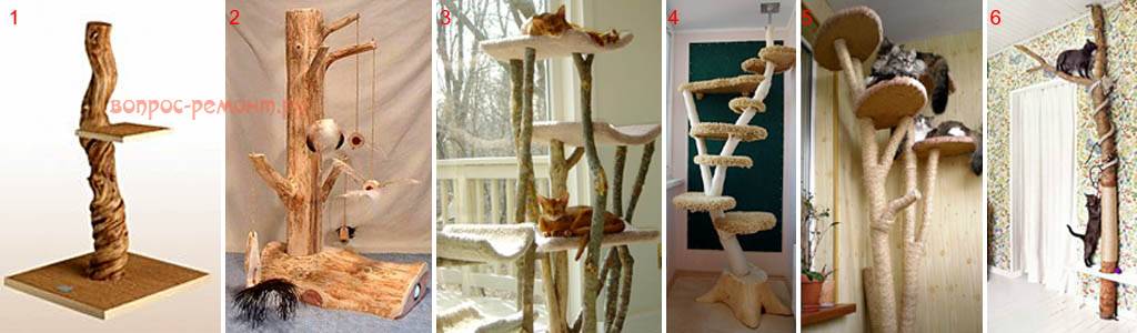 Гладкошерстные кошки как правило энергичны, цепки и охотно лазают. Деревянную когтеточку для них можно набрать из довольно тонких сучьев с корой, поз. 3. Длинношерстные же более флегматичны и не особые мастера карабкаться, поэтому деревянную заготовку нужно обматывать веревкой (поз. 4 и 5). Тем и другим вместе подойдет толстый сук, обмотанный частично, поз. 6.
