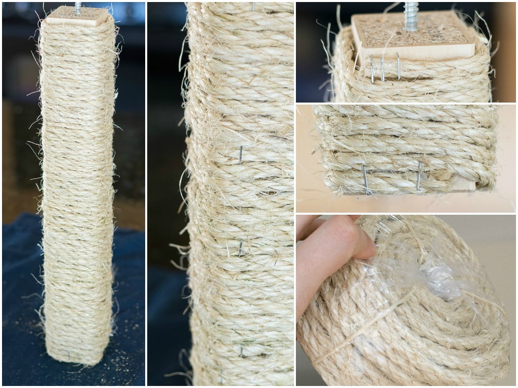 Теперь черед самой когтетки. В нашем проекте обернуты две ножки верхней конструкции и половина ножки внизу. Вы можете сделать столько когтеток, сколько пожелаете. Чтобы закрепить сизалевый канат вокруг ножки, также используем степлер.