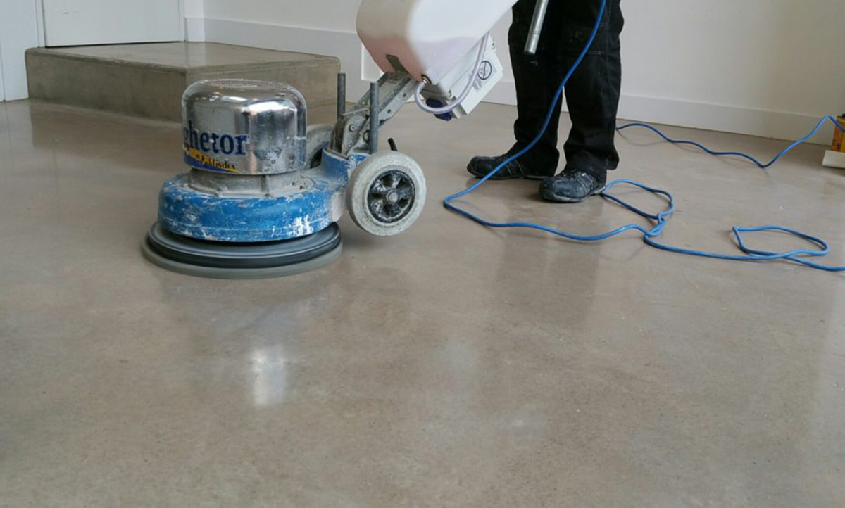 Фрезерование, шлифование и полировка выполняются на полностью затвердевшем полимерном бетоне, очищенном от жира и грязи, без предварительного смачивания. Армирующие элементы срезаются болгаркой. Отшлифованный бетон покрывают специальным упрочнителем, а затем полируют.
