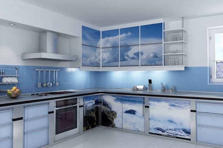 У каждого после ремонта остается плитка, которую можно использовать для того, чтобы обновлять кухню. Для этого не понадобится большое количество материала. Плиткой нужно выкладывать не все фасады. Фрагмент с уникальным рисунком стоит приклеить в центре. Он может иметь вид одной плитки или четырех штук меньшего размера, которые стоит выложить в форме ромба. При помощи мелкой плитки следует обклеить контуры шкафов. Нередко подобное украшение используют для декора нижнего или верхнего краев гарнитура. Изображение на плитке стоит выполнить в соответствии к общему стилю кухни.