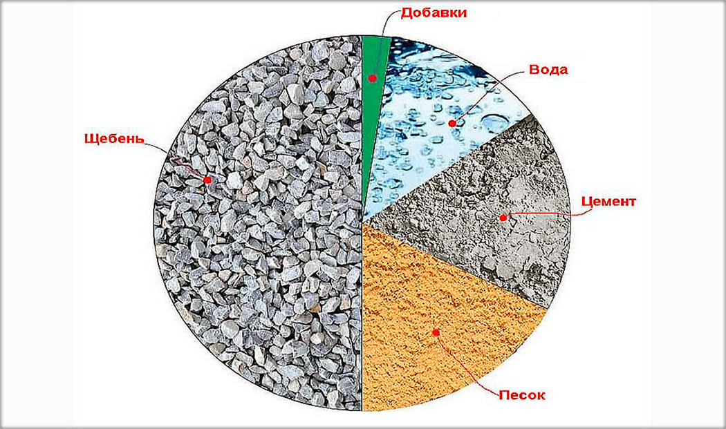 Основными компонентами для изготовления бетонных смесей являются цемент (Ц), песок (П), щебень (Щ), вода (В), вспомогательные добавки. От их качества и количества зависят эксплуатационные характеристики бетонов. Ориентируются на такое соотношение ингредиентов в зависимости от марки бетона (чем больше число в маркировке, тем выше прочность раствора):