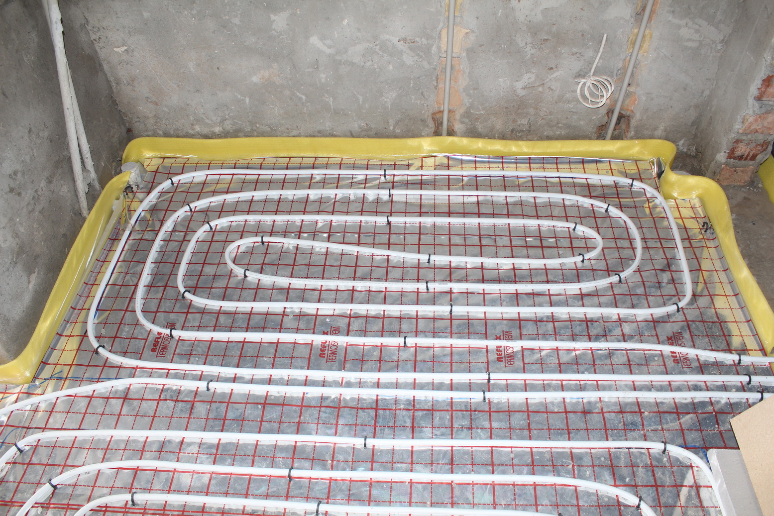 До укладки стяжки перемещаться по теплоизоляции с уложенными на нее трубами следует очень осторожно, лучше подкладывать под ноги куски фанеры или доски