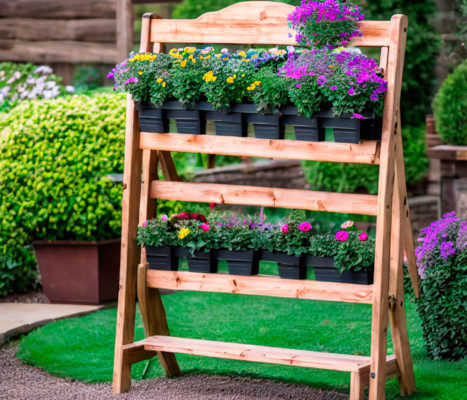 Такие цветники отлично смотрятся рядом с верандой или террасой, пристроенной к дому. Используя горшки различного объёма, также можно изготовить достаточно интересную вариацию вертикальной клумбы. Основу для цветника можно приобрести в специальном магазине или смастерить из сподручного материала своими силами.