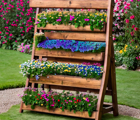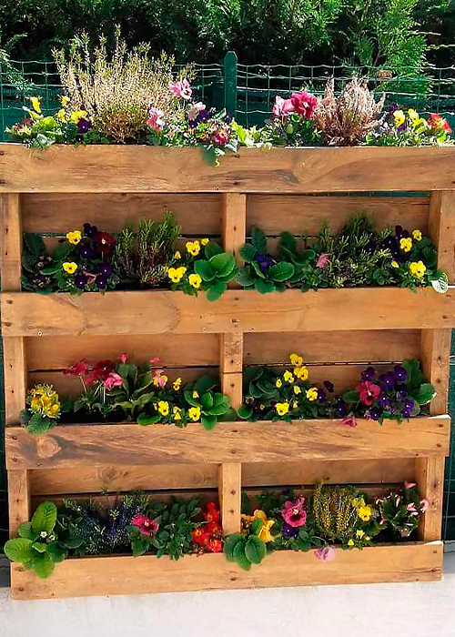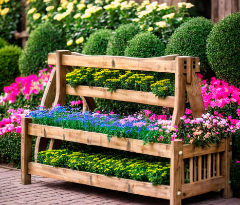 - Многоярусные. Предварительно монтируются специальные конструкции, имеющие несколько уровней. На них высаживают цветы и зеленые декоративные растения. Обычно подбирают компактные сорта.