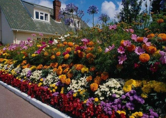 Цветники вдоль мощеных тропинок по типу бордюра создают из низкорослых цветов. Очень хорошо подобрать цветы таким образом, чтобы они зацвели одновременно. Такая клумба носит название рабатка.