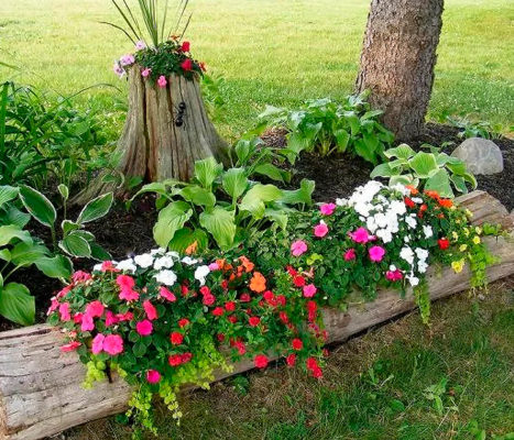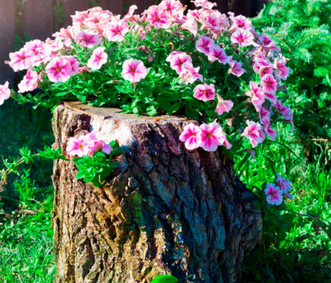 Огородники знают, как трудно удалить с участка старый пень. Если задача не выполнима, пень можно превратить своими руками в красочную клумбу. Простой выход из положения – поставить большую вазу с ампельными культурами. Листва растения свесятся вниз, прикроет неприметный пенек.