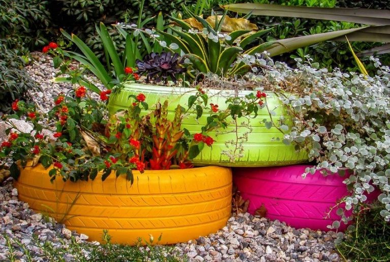 Вы можете использовать различные бросовые материалы с вашего участка для создания красивого дизайна клумбы. Например, в центре цветника можно поставить покрышку и высадить в ней вьющееся растение, которое в будущем своим стеблем закроет всю шину. Не бойтесь экспериментировать, воплощать свои оригинальные идеи и задумки.
