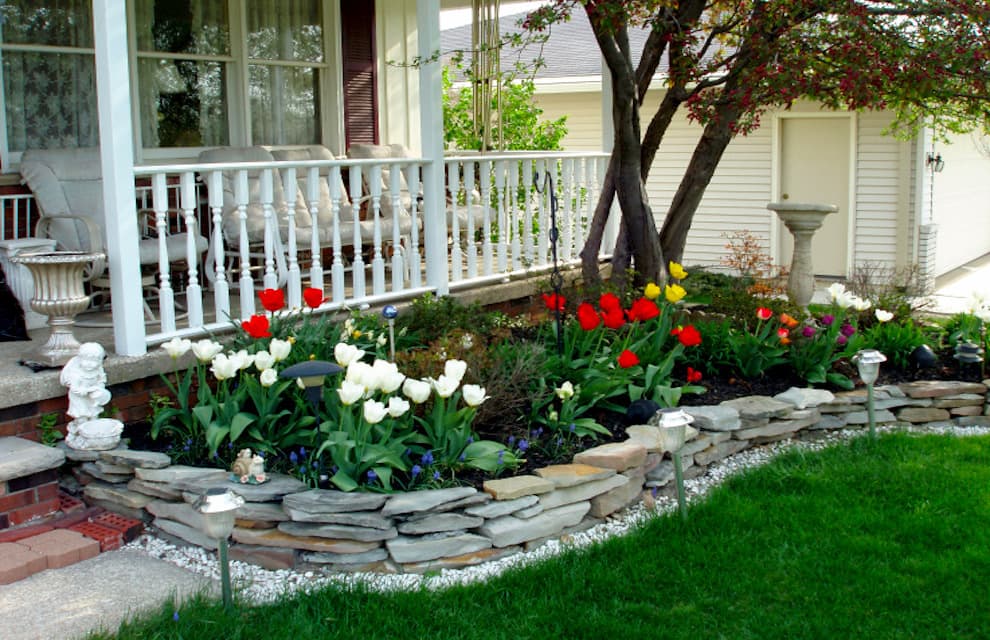 Примечание. Среди популярных дизайнов клумб и цветников перед домом можно выделить альпийскую горку и рокарий. Они создаются из камней, низкорослых растений, стелющихся растений, кустарников и хвои. Также, цветники можно разбивать любой формы: прямоугольной, круглой, квадратной.