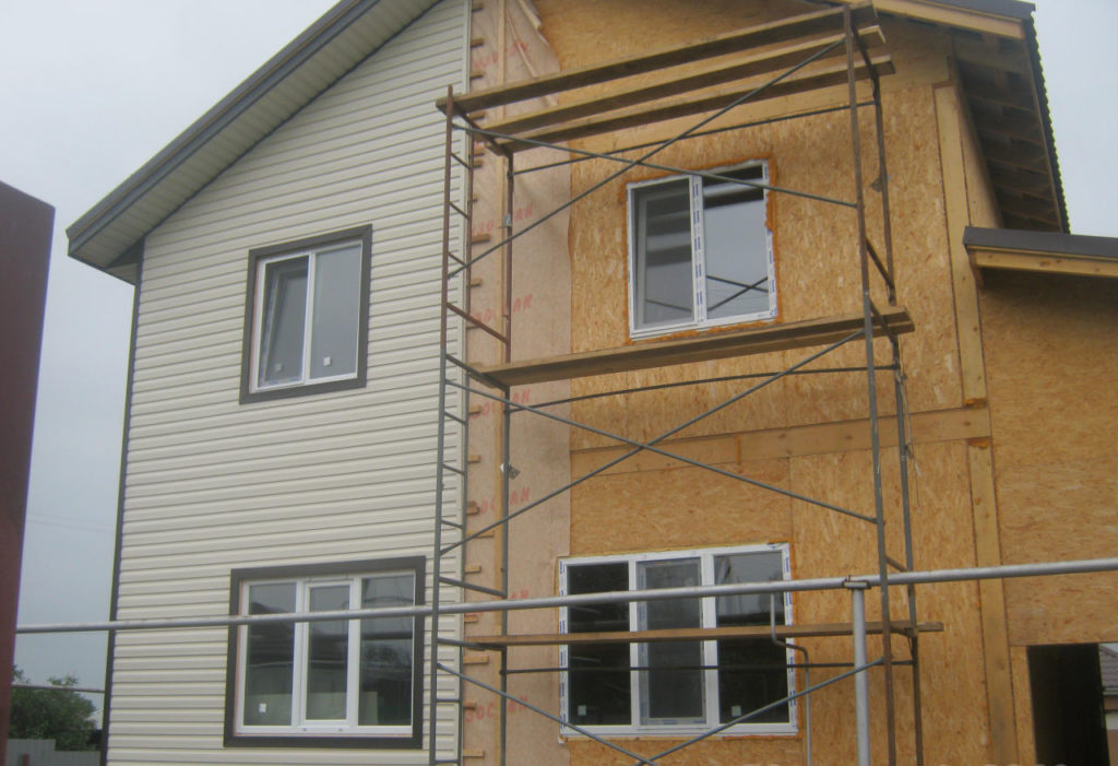 Каркасный дом. Это более современная технология. Строители делают каркас из дерева или металла, внутрь каркаса закладывают утеплитель и обшивают все с двух сторон, как правило, ОСП-панелями — это плиты из прессованной древесной стружки.