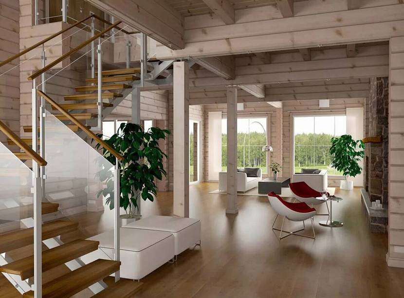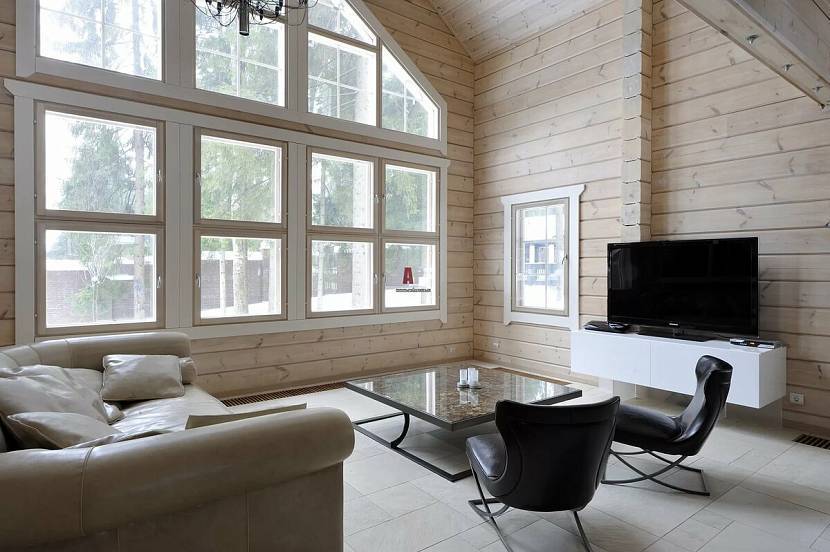Напольное покрытие делают из высококачественной древесины. Отделка стен с потолками выполняется под дерево. Если жилое сооружение принадлежит частному лицу, то выбирают, как правило, светлые оттенки дерева.