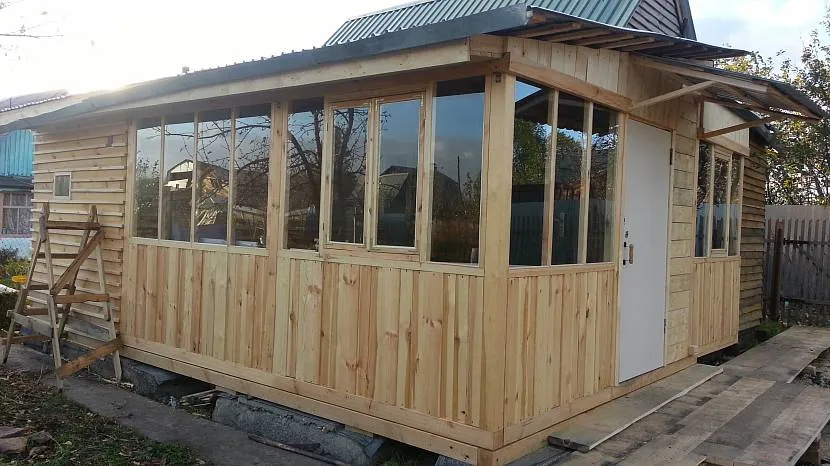 Пристройка может быть выполнена в виде веранды. Помещения такого типа пристраиваю к стене основного здания. Веранда – это зарытая конструкция, которая может отапливаться в зимний период. На лето некоторые хозяева демонтируют рамы, превращая комнату в открытую террасу.